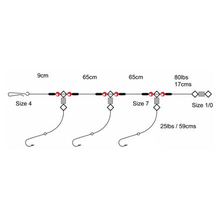 A derivative of the three-hook flapper where one of the hook snoods is positioned directly above the lead. This gives the angler two hooks fishing in the water column at the top and middle of the rig body, whilst the lower snood is fishing directly on the bottom. Three hooks allow the angler to fish with multiple baits and to increase the scent trail to attract more fish and a wider variety of them. The different positions of the hook snoods give the angler a competitive advantage to cover different types of species, covering fish that feed off the bottom and those who fish directly on it.